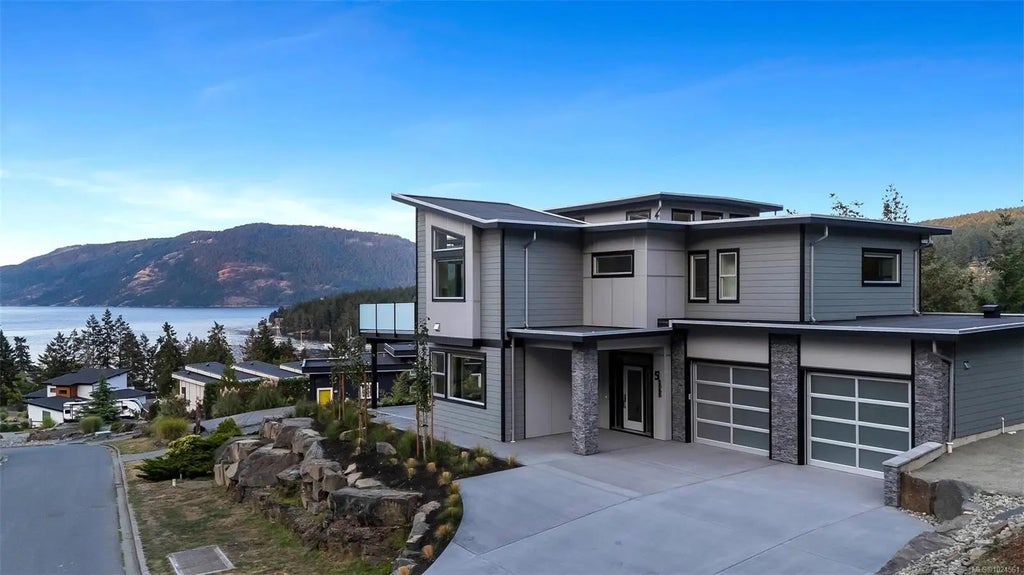 This stunning, brand-new home built by Larry Nylen Construction is now complete and ready for a discerning buyer. Enjoy elevated water views of Maple Bay, Saltspring Island and beyond from this thoughtfully designed 3,200+ sqft residence with 4 bedrooms and 3 bathrooms. The main level features 9–14' ceilings, oversized windows, engineered wood floors, and a gorgeous kitchen with Wolf range, Fisher & Paykel panelled fridge & dishwasher, plus a spacious pantry. The primary suite offers a walk-in closet and luxurious 5pc ensuite. Automated Hunter Douglas blinds throughout the entire home add ease and elegance. Downstairs offers 2 large bedrooms with walk-in closets and a huge rec room with wet bar and walk-out patios. Additional highlights include a double garage, heat pump, 2/5/10 new home warranty and Step 4 BC energy code construction. Water and sewer are included in the monthly fee.